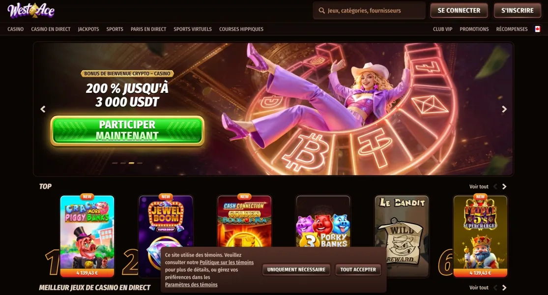 Pour les joueurs français, un pack de bienvenue comprenant des bonus sur les trois premiers dépôts a été préparé, ainsi que des promotions dédiées aux utilisateurs de cryptomonnaies. Le site web de Westace fonctionne comme une application PWA, ce qui garantit un fonctionnement fluide sur les appareils mobiles sans nécessité de télécharger de logiciel. De plus, la plateforme prend en charge des méthodes de paiement modernes – notamment Jeton, MiFinity ainsi que des cryptomonnaies telles que l'USDT et l'Ethereum.